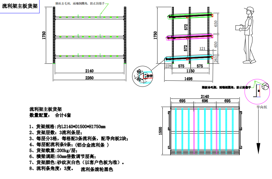 上圖是我們司給聯(lián)想公司生產(chǎn)的流利式貨架,貨架參數(shù)是:L2140*W1500*H1750 三層流利條 每層分3格、每層配3條流利條,配導(dǎo)向板2塊、每層配9條流利條(鋁合金流利條)每層載重200KG 橫梁調(diào)距是50mm倍數(shù)調(diào)節(jié)層高。貨架顏色:以客戶樣本為準(zhǔn) 流利條的角度為3度,流利條滾輪黑色.